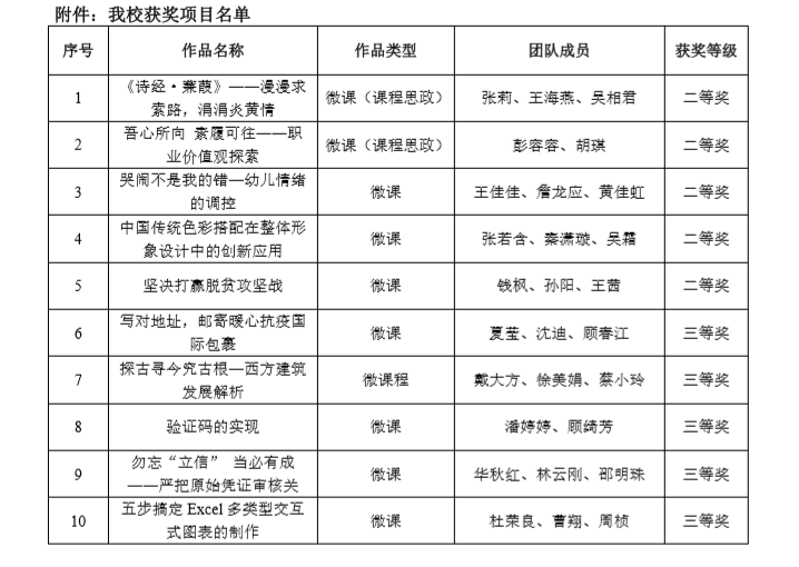 近日,从江苏省高校微课教学比赛组委会获悉,我校有10项微课作品获奖,其中二等奖5项、三等奖5项,获奖数量取得历年最好成绩。