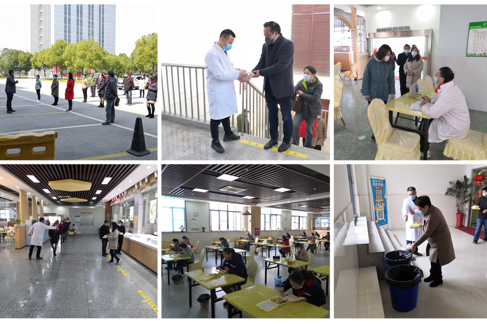 各部门、学院代表人员于食堂广场集中,统一接受疫情期间师生取餐、就餐新规范的培训,全体人员按间隔至少一米的规定排队进入食堂,逐一接受体温检测,进行了个人情况登记,随后按照地标的指示,分流至三个窗口完成取餐,以“一人一桌”、“定向就餐”的方式用餐,最后根据垃圾分类规定完成易腐垃圾的分类工作,并按照地面及墙面标识离开餐厅,过程中所有人使用单一动线,无人群交叉及线路重叠。