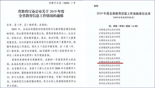 近日,江苏省教育厅办公室发布了《关于2019年度全省教育信息工作情况的通报》(苏教厅办函〔2020〕1号),我校获评2019年度全省教育信息工作表彰单位,排名跻身全省高职(专科)院校前十。 “全省教育信息工作表扬单位”是江苏省教育信息宣传工作方面官方认定的最高荣誉称号,主要依据《专报信息》《江苏教育工作简报》和江苏教育网信息的采用情况,实行积分制量化考核。 2019年,我校坚持以习近平新时代中国特色社会主义思想和党的十九大精神为指导,以学习贯彻落实全国、省市教育大会精神为主线,紧紧围绕省市和上级教育主管部门的重大决策部署,结合我校实际,及时、准确、全面地收集、整理、挖潜、编写、报送了大量有价值的信息,内容涵盖党建思政、教育教学、人才培养、师资队伍、校园文化、社会服务等方面,为上级部门了解情况、指导工作和科学决策提供了有力的信息支撑。全年累计在上级教育主管部门平台和校外各级媒体发布我校信息90余条,特别是凝练报送的开展“不忘初心、牢记使命”主题教育、学习贯彻党的十九届四中全会精神、庆祝新中国成立70周年、思想政治理论课建设等重要信息被刊发后,在社会上产生良好反响。 长期以来,在校党委的领导下,我校高度重视教育信息工作,各二级学院、各部门密切配合,紧紧围绕学校中心工作,遵循学校整体工作思路,及时总结宣传学校经验做法、主要成效、特色亮点,不断提升教育信息发布质量和水平,为充分彰显学校形象、扩大学校影响力和美誉度贡献了力量。