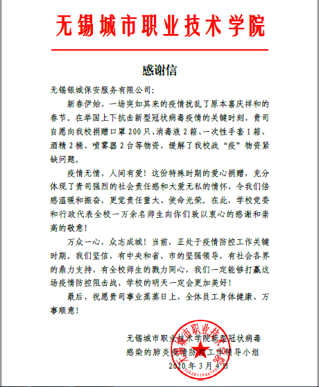 | 【同心抗疫】无锡银城保安服务有限公司向我校捐赠防疫物资 | |||