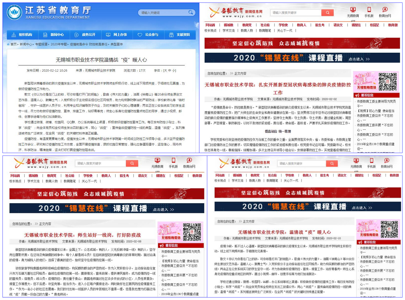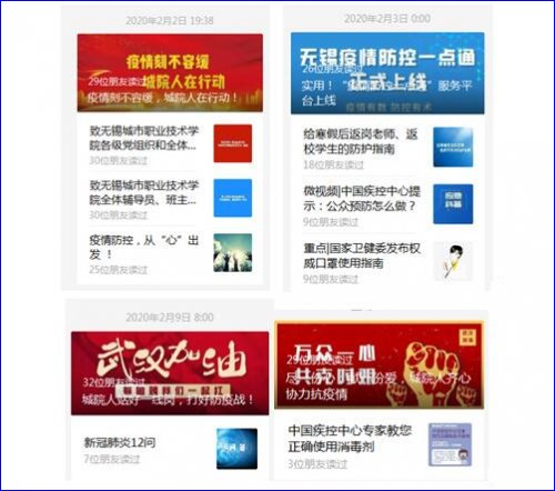 新型冠状病毒感染的肺炎疫情发生以来,学校认真落实中央、省、市委和省、市教育主管部门的工作部署,把疫情防控作为当前最重要的工作来抓。在疫情防控阻击战打响之际,学校党委迅速吹响“抗疫集结号”,以新媒体的传播时效,为抗疫发声,围绕“防控政策”“宣传动员”“战‘疫’典型”“‘声’援一线”“志愿服务”“防控知识”“心理疏导”“网络课堂”等主题强信心、聚民心、暖人心,传递正能量。 提高站位强信心。印发《无锡城市职业技术学院新型冠状病毒感染的肺炎疫情防控宣传工作方案》,指导全校各级单位及时做好防控科普知识宣传教育、信息发布等工作,并动员广大师生积极参与疫情防控宣传,凝聚起打赢疫情防控阻击战的磅礴力量。充分利用学校OA办公系统,校园网,微信公众号,微信、QQ工作群等渠道全方位传达上级关于疫情防控的最新指示、批示精神,以及学校疫情防控领导小组的工作举措,发布《致全校师生的一封信》《致全校各级党组织和全体党员的一封信》《致全体辅导员、班主任的一封信》等,在政策宣传中进一步引导全校党员干部和师生增强“四个意识”、坚定“四个自信”、做到“两个维护”。 典型报道聚民心。深入挖掘学校防控一线的典型事迹和先进人物,近日,已连续报道师生先进事迹20余篇:教师当起“临时妈妈”,守护一线人员子女;入党积极分子主动担当,深入社区开展志愿服务;青年学子坚守实习岗位,为防疫贡献青春力量;安保人员日夜值守,筑牢学校疫情防控的第一道防线等先进事迹多次被省教育厅、市教育局官方网站宣传报道,引起师生强烈反响,择优组织推选无锡“最美战‘疫’先锋”,进一步发挥先进典型的引导力、感染力和影响力。组织开展以疫情防控为主题的文艺作品展示活动,散文《你以为你是在门上的锁,可你却是打开门的钥匙》,歌曲《伟大的力量》,油画《钟南山》等百余份师生原创文艺作品,温暖人心、鼓舞士气。 科学防控暖人心。利用各类有效载体,强化疫情防控科普宣传,转发《预防新型冠状病毒,如何保护自己和他人》《新型冠状病毒感染的肺炎高校防控指导手册》《疫情防控,从“心”出发》等20余篇权威防控科普文章,引导师生理性认识疫情、科学应对疫情、全面战胜疫情,坚决做到不信谣、不造谣、不传谣。利用宣传栏、横幅等张贴科普知识,发布疫情防控宣传口号,营造了良好校园疫情防控氛围。 省教育厅、市教育局官方网站多次宣传报道我校疫情防控举措和师生先进事迹 营造良好的校园疫情防控氛围 充分利用新媒体做好疫情防控宣传引导工作 |