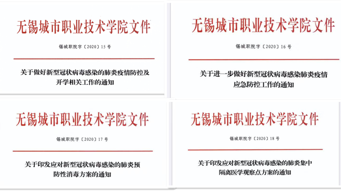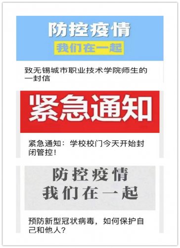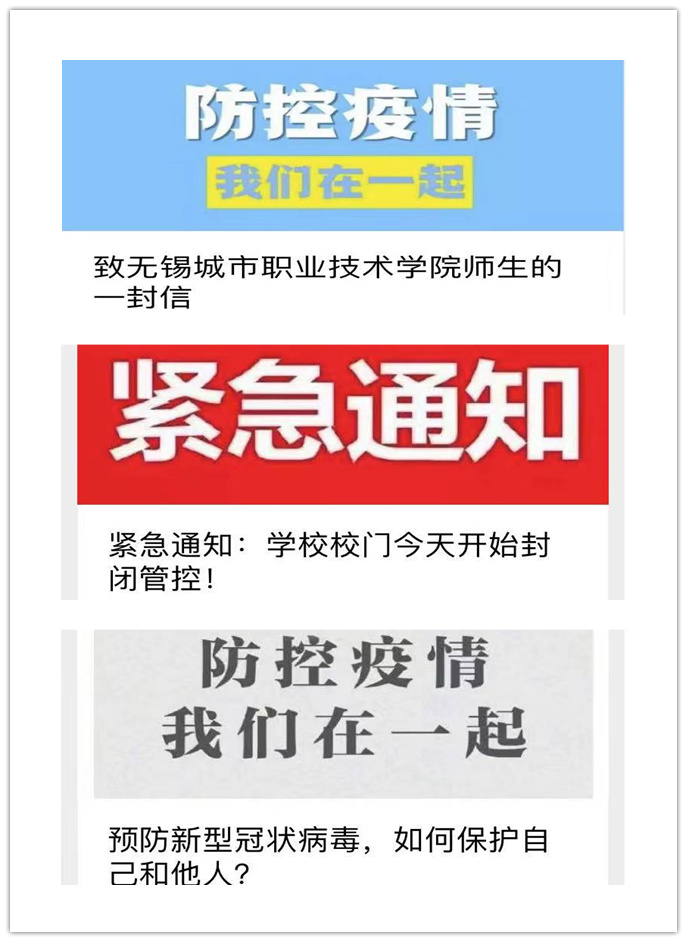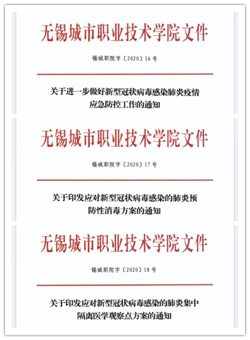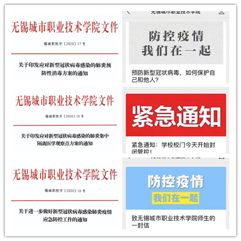 强化应急值班值守。学校严格落实特殊时期值班值守工作,1月28日,学校发布“关于新型冠状病毒感染的肺炎疫情防控期间行政总值班的通知”,确保24小时值班和领导带班制度。校主要领导承担防疫工作的主体责任,每天至少一人在校在岗。中层干部、保卫人员、医务人员每天24小时在岗值班,保持电话24小时畅通。值班人员及时处置各类突发事件,并做好值班记录和信息报送工作,对发生的异常情况,第一时间向学校防控办、保卫处等部门报送。 加强防控宣传教育。学校疫情防控工作领导小组通过微信公众号、微信群、QQ群等渠道持续开展新型冠状病毒感染的肺炎的防控宣传教育,发布“致无锡城市职业技术学院各级党组织和全体共产党员的一封信”“致无锡城市职业技术学院师生的一封信”“致无锡城市职业技术学院全体辅导员、班主任的一封信”,向师生宣传普及新型肺炎传播途径、症状和防范知识和措施,引导广大师生以科学的方式防范疫情;提醒师生不提前返校,不参加各类聚集性活动,避免引发疫情扩散;提醒师生理性判断各类网络信息,做到不恐慌、不信谣、不传谣,以平和的心态面对疫情,传递抗击疫情的正能量;号召全体师生员工、党员干部齐心协力、群防群控,切实做好疫情防控工作。