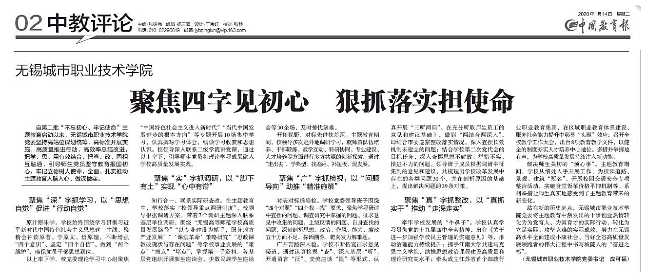 2020年1月14日,《中国教育报》刊发校党委书记应可福署名文章《聚焦四字见初心、狠抓落实担使命》。 自第二批“不忘初心、牢记使命”主题教育启动以来,无锡城市职业技术学院党委坚持高站位谋划统筹,高标准开展实施,高质量推进行动,高效率总结改进,把学、思、用有效结合,把查、改、固相互融通,引导师生党员坚守教育报国初心,牢记立德树人使命,全面、扎实推动主题教育入脑入心、做深做实。 聚焦“深”字抓学习,以“思想自觉”促进“行动自觉” 原汁原味学。学校始终围绕学习贯彻习近平新时代中国特色社会主义思想这一主线,聚精会神读原著、学原文、悟原理。不断增强“四个意识”、坚定“四个自信”、做到“两个维护”,确保党员干部思想到位。 以上率下学。校党委理论学习中心组聚焦“中国特色社会主义进入新时代”“当代中国发展进步的根本方向”等专题开展10场集中学习,认真撰写学习体会,畅谈学习收获和思想认识。校领导深入联系二级学院讲党课,通过以上率下,引导师生党员将理论学习成果融入学校高质量发展实践。 党委理论学习中心组开展“不忘初心、牢记使命”主题教育集中学习 学校特邀杰出校友、社科名家胡福明主讲“不忘初心、牢记使命”主题教育报告会 聚焦“实”字抓调研,以“脚下有土”实现“心中有谱” 知行合一,联系实际研查改。在主题教育中,学校落实“校领导重点调研制度”,校领导根据调研方案,带着7个调研主题深入联系基层单位调研,围绕“无锡高等师范学校高质量发展路径”“以专业建设为抓手,服务地方产业发展”“‘课堂革命’策略研究”“思政课教改现状与存在问题”等学校事业发展的“难点”“痛点”“堵点”,掌握第一手资料。各基层党组织开展新生座谈会、少数民族学生座谈会等30余场,及时排忧解难。 开拓视野,对标先进找差距。主题教育期间,校领导多次赴外地调研学习,就师资队伍培养、干部锻炼、教学互动、科研协同、专业建设、人才培养等方面进行多方共赢的创新探索。通过“走出去”,学典型、找差距、补短板、促发展。 校领导深入联系基层单位调研 校领导率队赴南京信息工程大学滨江学院洽谈合作 聚焦“广”字抓检视,以“问题导向”助推“精准施策” 对表对标准确检。学校党委领导班子围绕“四个对照”“四个找一找”要求,聚焦学习研讨中查摆的问题、调查研究中掌握的问题、征求意见中收集的问题,上级反馈的问题、自身查找的问题,深刻剖析思想、政治、作风、能力、廉政五个方面不足,探因溯源,靶向发力解难题。 广开言路深入检。学校不断拓宽征求意见渠道,通过认真检视“查”、深入基层“听”、开通留言“征”、交流座谈“提”等形式,认真开展“三听两问”。在充分听取师生员工的意见和建议基础上,做到“两结合两深入”,即结合市委巡察整改落实情况,深入查摆长效机制未建立的问题;结合学校第二次党代会的目标任务,深入查摆思想不解放、举措不实、推进不力的问题。领导班子成员根据调研中征集到的意见和建议,共梳理出学校改革发展中存在的各类问题30个,并在剖析原因的基础上,提出解决问题的39条对策。 召开对照党章党规找差距专题会 基层党组织召开检视问题专题会 聚焦“真”字抓整改,以“真抓实干”推动“走深走实” 牵牢学校发展的“牛鼻子”。学校认真学习贯彻党的十九届四中全会精神,出台《关于进一步加强学校民主管理的实施意见》等,推动治理能力持续提升;携手江南大学共建马克思主义学院,助推思想政治课程建设高质量和理论研究高水平;牵头成立江苏省首个邮政行业职业教育集团,在区域职业教育体系建设、服务社会能力提升中彰显“头雁”效应;召开全校教学工作大会,出台8项教育教学文件,以健全的制度夯实人才培养中心地位。多措并举掷地有声,为学校高质量发展持续注入新动能。 解决师生关切的“烦心事”。主题教育期间,学校从细处入手开展工作,为校园道路、景观、建筑“冠名”,开展校园交通安全专项整治活动,实施食堂饭菜价格平抑机制等。系列举措让师生真实地感受到了主题教育带来的新变化。 牵头成立江苏省邮政行业职业教育集团 携手江南大学共建马克思主义学院 站在新的历史起点,无锡城市职业技术学院党委将主题教育中激发出的干事创业热情转化为为党育人、为国育才的实际行动,转化为立足实际、攻坚克难的实际成效,努力在无锡高水平全面建成小康社会、当好全省高质量发展领跑者的伟大征程中书写城院人的“奋进之笔”。 |