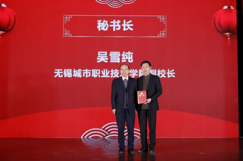 理事长应可福为副秘书长颁发证书 集团理事长、校党委书记应可福讲话。他指出,集团化发展战略,是深入贯彻党的十九大精神和“职教二十条”,推进职业教育产教融合、校企合作的重要载体,也是办好新时代职业教育的重要举措。成立江苏省邮政行业职业教育集团是加快发展现代邮政职业教育的客观需要;符合国家发展行业职业教育的战略方向;有利于形成邮政类职业教育网络格局;有利于加强邮政行业组织对职业教育的指导;有利于探索职业教育集团新型治理体系。应可福从四个方面介绍了江苏省邮政行业职业教育集团的工作设想:一是团结合作、互利共赢;二是突出特色、提升品质;三是资源共享、深化研究;四是立足实际、创新发展。应可福表示,作为江苏省邮政行业职教集团新任理事长,深感责任重大,将和全体集团理事精诚团结,紧密合作,把产教融合进一步做深做实,做出成效,积极争创全省、全国示范性职业教育集团,共同书写江苏邮政行业和职业教育的崭新篇章。 会上,江苏省邮政管理局人事处副调研员张璐宣读了《关于确定新增江苏省邮政行业人才培养基地的通知》。无锡城市职业技术学院、江苏建筑职业技术学院、江苏食品药品职业技术学院等三家单位获批江苏省邮政行业人才培养基地。与会领导为江苏省邮政行业人才培养基地授牌。