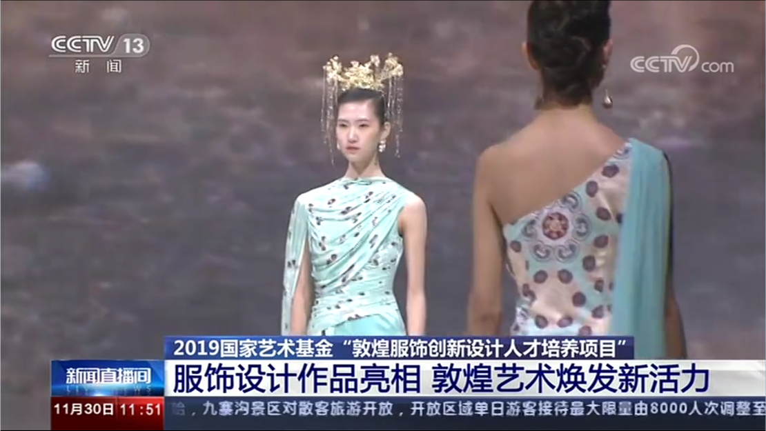 11月27日,我校人物形象设计专业教师李叶红服装设计作品《大美敦煌——曹衣出水》亮相北京服装学院《敦煌服饰创新设计人才培养项目》结项展,并随展在中央电视台、北京电视台等多家媒体报道。