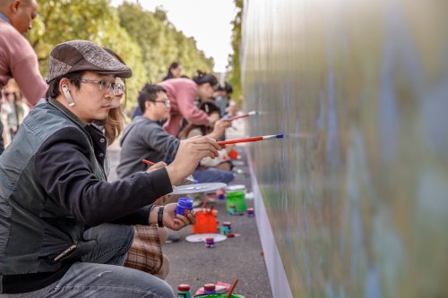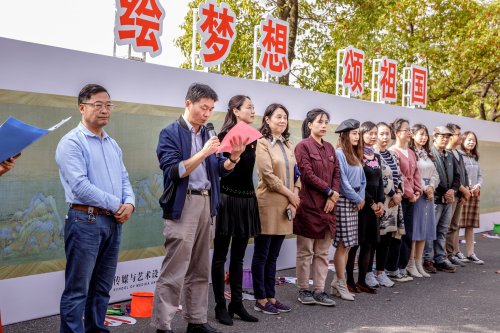 为庆祝新中国七十华诞,推进“不忘初心,牢记使命”主题教育工作,传媒与艺术设计学院举行了“忆初心、记使命、绘梦想、颂祖国”《千里江山图》创意手绘活动。党委副书记俞力元,党委委员、组织部部长王建出席了,学院全体党员及部分学生参加了此次活动。 党委副书记俞力元致辞 俞力元在致辞中对传媒与艺术设计学院在“不忘初心,牢记使命”主题教育工作中思政教育与专业教育有机融合的方式表示充分肯定,对近年来学院所取得的优异成绩表示高度赞许,希望学院进一步强化“理实交融”的教育理念,推动艺术设计教育向更高层次跨越,成为无锡城市职业技术学院特色鲜明的文化品牌。 北宋著名画家王希孟的《千里江山图》以“咫尺有千里之趣”的表现手法描绘了祖国的锦绣河山,画作的意境契合了中华人民共和国成立70周年以来经济、社会的全面腾飞。俞力元,王建为《千里江山图》开笔,为祖国的大美江山添彩。学院教师党员们集体用画笔勾勒出全体师生的设计梦想,讴歌新中国所取得的辉煌成就。学生们在各自负责的区域点画晕染,表达对祖国七十华诞的美好祝愿。