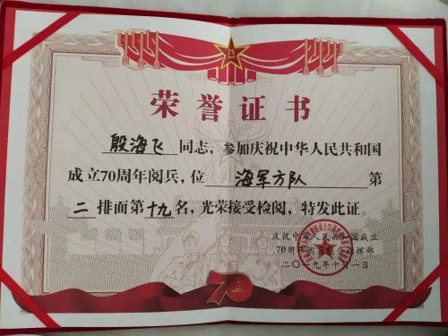 10月1日上午,庆祝中华人民共和国成立70周年大会在北京天安门广场隆重举行!我校全体师生通过电视、手机、互联网等多种方式观看了盛大的阅兵仪式,令人欣喜的是,在威武雄壮的海军方阵中,有一名无锡城市职业技术学院学子位列其中。 这个帅气小伙名叫殷海飞,是我校传媒与艺术设计学院2017级广告设计与制作专业的学生。2018年暑假,即将升入大学二年级的他,毅然响应国家鼓励大学生应征入伍的号召,光荣入伍,服役于海军青岛某部队。在部队第一年,被推荐参加了士官培训,经过严格选拔,获得了参加国庆阅兵的资格,因其表现出色,综合条件优异,被安排在海军方阵的第二排中间位置。阅兵当天,殷海飞同学和方阵的全体战士一起,意气风发、豪情满怀,接受祖国和人民的检阅,成为了所有城院人的骄傲! 从左往右第二位为殷海飞 荣誉证书 不忘初心,牢记使命!殷海飞同学用自己的切身经历很好地诠释了这句话的真正含义,无论身处何地,无论从事何种职业,都始终牢记自己的职责和使命!一次受阅,终身荣耀!希望我们未来能培养出更多像他一样的学生,以青春之名,为母校争光,为祖国添彩! |
