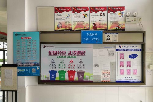 “四分类”垃圾回收站 分类宣传到身边 为加强垃圾分类在师生生活中的影响力,我校在学生宿舍入口及公共区域人流密集区张贴了“垃圾分类,从我做起”宣传知识展板,以图文形式将垃圾分类知识拉近到师生身边,方便师生随时随地查看,潜移默化地改变师生垃圾放置习惯,做到科学分类宣传无处不在。