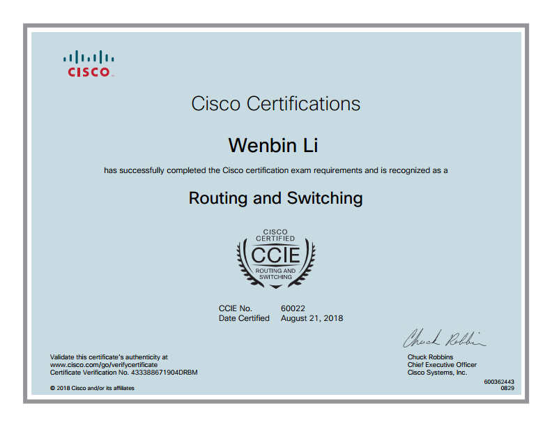 我院物联网工程学院优秀学子李文彬,通过一系列学习于2018年8月在香港顺利考取CCIE思科认证互联网专家证书。 思科认证是美国Cisco公司于1993年开始推出的认证考试,有CCNA—CCNP—CCIE三个级别,CCIE思科认证互联网专家(Cisco