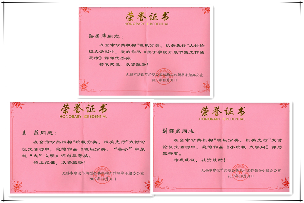 为认真贯彻落实绿色发展理念,增强公共机构节能的前瞻性、持续性和有效性,充分发挥党政机关在推动绿色发展、建设生态文明中的示范引领作用,无锡市建设节约型公共机构工作领导小组于今年10月发起了关于“垃圾分类、机关先行”大讨论征文活动。 全市各大机关、学校、医院等各级公共机构和工作人员积极响应,共投稿征文1502篇。我院也积极参与,经筛选后投稿14篇,并在激烈的评选中脱颖而出,荣获“优秀组织奖”,我院也是10家荣获“优秀组织奖”单位中唯一一家学校单位,我院王菲、刘丽君、孙国华三位老师的征文荣获三等奖。 此次征文活动中,我院充分准备,积极参与,发挥了教职员工的主观能动性,调动了全体师生及工作人员对于“节能降耗”工作的热情。活动也为我院节能减排工作的有序开展提供了借鉴,拓展了思路,提出了新的方向和突破点。 荣誉证书 |