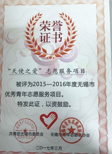 近日,从团市委、无锡市青年志愿者协会联合发布的《关于公布2015-2016年度无锡市优秀青年志愿者、志愿组织和项目的通报》获悉,我院“天使之爱”志愿服务项目荣获“2015-2016年度无锡市优秀青年志愿服务项目”,校青年志愿者协会荣获“2015-2016年度无锡市优秀青年志愿组织”。 “天使之爱”志愿服务项目是由我院会计学院围绕大学生自我成长、帮助他人、服务大众、回报社会等主题开展的一系列志愿者活动,包括:“爱环保”——用鼓掌的双手做环保、“爱成长”——档案见证成长、“爱公益”——用爱滋润心田等。 校青年志愿者协会始终坚持“奉献、有爱、互助、进步”的志愿服务精神,服务内容涵盖扶贫、助残、为老、环保等领域,创建了多个品牌项目,其中“彩虹桥”服务特殊儿童项目、“送教到家”助残项目、“走向操场、走进阳光”助力胡埭小学学生拓展户外活动项目等受到了社会各界的关注和认可。“彩虹桥”项目曾荣获“2013-2014年度无锡市优秀青年志愿服务项目”、2016年度江苏省青年公益项目二等奖,第三届中国青年志愿服务项目大赛江苏赛区推荐项目等荣誉。