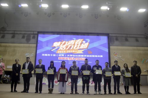 近日,由无锡团市委、无锡市教育局、无锡市学联共同举办2015-2016年度无锡市十佳(优秀)大学生社团评选落下帷幕。经过校园海选、初赛推报、市级评审、网络投票、现场总决赛暨风采Show等环节比拼,我院选送的第一映像社、新月文学社两个学生社团,荣获“2015-2016年度无锡市优秀大学生社团”称号。王彧、王树君两位同志获得“社团优秀指导教师”称号。 此次活动,旨在促进大学生社团健康蓬勃发展,营造浓厚的校园文化氛围,引导大学生追求健康、时尚、文明的校园生活方式,闪耀青春才华,彰显活力与风采。近年来,我院高度重视学生社团建设,将学生社团建设与学风建设、专业建设相融合,积极搭建活动平台,使社团成为新形势下凝聚青年、培育青年的重要途径,通过对学生社团的组织、引导和管理,依托社团加强思想政治教育取得了明显成效。