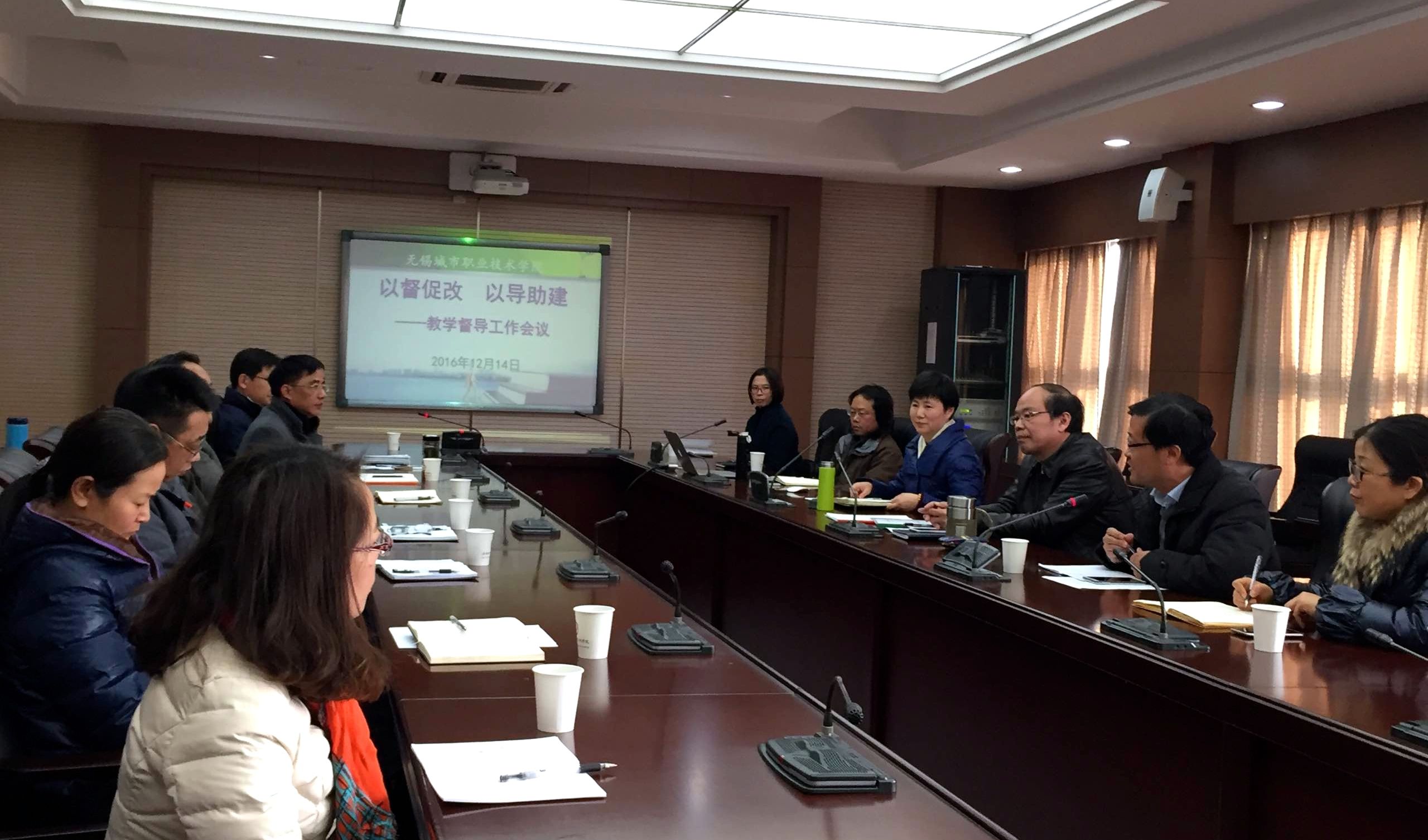 12月14日,无锡城市职业技术学院教学督导工作会议在办公楼308会议室召开。学院院长应可福、教务处处长王建、各二级学院(部)负责人、教学督导专家组全体成员出席了会议。会议由教学督导室副主任殷娴主持。 会上,殷娴副主任首先从团队建设、制度建设、督导活动、报告撰写、合作交流五方面回顾了我院2016年教学督导工作的总体情况。传媒与艺术设计学院督导员马永伟、会计学院督导员胡瑛琳、基础课部督导员沈剑分别介绍了各自学院(部)以教学督导工作促进课程与教学改革、助推专业建设的成功经验。教务处王建处长作为督导专家感谢二级学院(部)领导对教学督导工作的支持,并表示今后将在“导”的方面多做些工作,发挥教学督导在课堂教学改革方面的引领作用。 应可福院长对下一阶段的教学督导工作出指示。他指出,教学督导工作应服务于我院教学质量的提升。学院已经构建了较为完善的教学督导组织和制度体系,教学督导除了检查、监督,更重要的是要指导。督是手段、导是目的。他强调,今后教学督导工作的重点将在做好课堂教学质量监控的基础上,逐步向人才培养方案、实训环节、毕业设计(论文)方面拓展,同时根据各二级学院(部)的专业特点确定不同的督导内容与重点。希望各二级学院(部)能支持、重视教学督导工作,加强教学信息反馈意见的落实。 教学督导工作会议现场