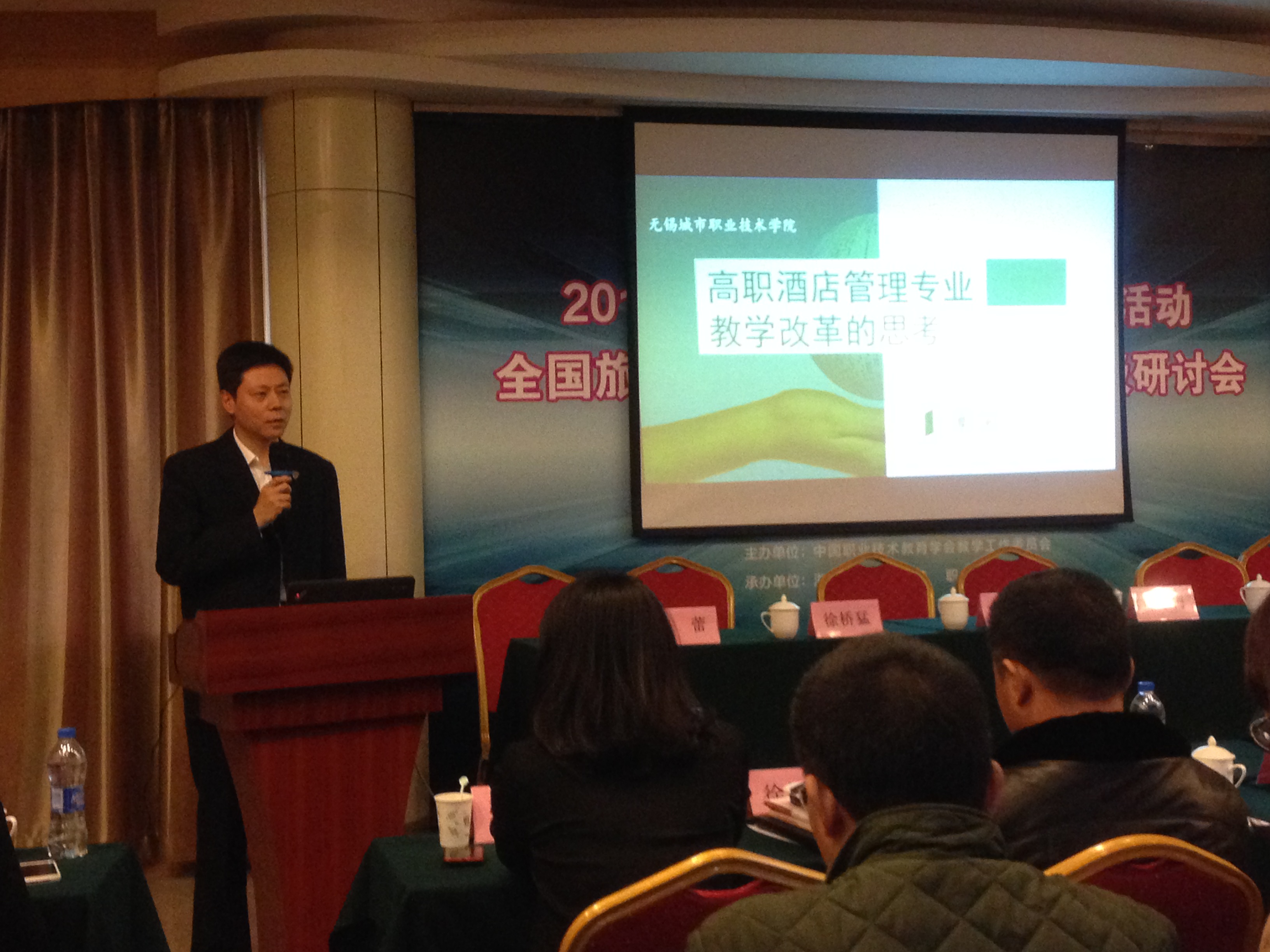 12.2日-4日, 2016年全国旅游类专业创新与实践高级研讨会暨骨干教师培训班在杭州举行。我院副院长瞿立新应邀出席会议并作“酒店管理专业教学改革的思考”主题报告。 此次研讨会由中国职教学会教学工作委员主办,来自全国42所院校旅游类专业120名教师参会,中国职教学会教学工作委员会副主任席东梅、浙江旅游职业学院党委书记王昆欣、高等教育出版社上海出版事业部副主任刘悦珍等专家出席活动并共同探讨旅游类专业课程建设与教学改革等热点问题。研讨会旨在适时把握旅游类专业发展的新动态,顺应“互联网+”时代背景,加强全国旅游院校间的交流与合作,推动产教融合与校企合作,探讨旅游人才培养及旅游类专业的发展,提升旅游专业教育和旅游产业在全国的位次。 我院副院长瞿立新在主题报告中指出,酒店管理专业要高度契合区域旅游业发展,深入研究不断涌现的旅游新业态,适时修订专业教学标准,准确把握人才培养目标和规格,科学制定人才培养方案,全面提升旅游高等职业教育人才培养的专业化、规范化、国际化水平。 我院旅游学院副院长李光宇、旅游学院院长助理邵映红也参加了研讨活动。 研讨会现场 我院副院长瞿立新作“酒店管理专业教学改革的思考”主题报告