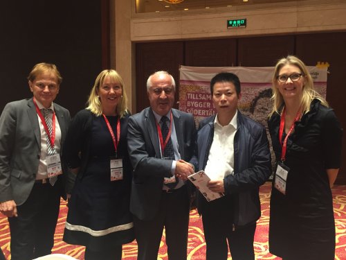 11月2日,第八届无锡市国际友好城市交流会开幕,院党委书记高建宁教授出席大会分会——对口项目洽谈会,并与瑞典南泰利耶市市长贝西姆·阿霍一行进行了会谈。 高书记说,无锡城市职业技术学院近年来坚持“走出去”与“引进来”相结合,不断开拓高职教育国际化道路,在中外合作办学和证书合作上取得了长足的发展,特别是2014年启动“百名教师出国境项目”以来,圆满完成既定目标,汉语教师项目取得实质进展。在刚过去的9月,首批“海外短期留学生团组”交流项目成功举办,学校专业教学水平及办学成绩得到了广泛认可。同时也希望能与南泰利耶市开展师生短期互访,孔子课堂等可行性合作的项目。 贝西姆·阿霍说,通过会谈,代表团对学院的专业分布和国际教育交流开展情况加深了了解,希望能进一步加强双方交流,开展项目合作,推进两地友好城市交流。 国际合作学院(外事办公室)相关人员也参加了会谈。 院党委书记高建宁与瑞典南泰利耶市市长贝西姆·阿霍一行合影