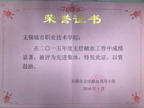 无锡市公民献血办公室为我院颁发了“2015年度无锡市单位集体无偿献血荣誉证书”,我院职工如需用血,凭此证书可优先供血,免交年度用血互助金。