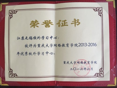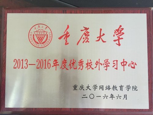 近日,从我院干训与继教学院获悉,干训与继教学院(重庆大学网络教育学院无锡学习中心)今年被重庆大学网络教育学院评为2013-2016年度优秀校外学习中心,并获得奖牌及荣誉证书。