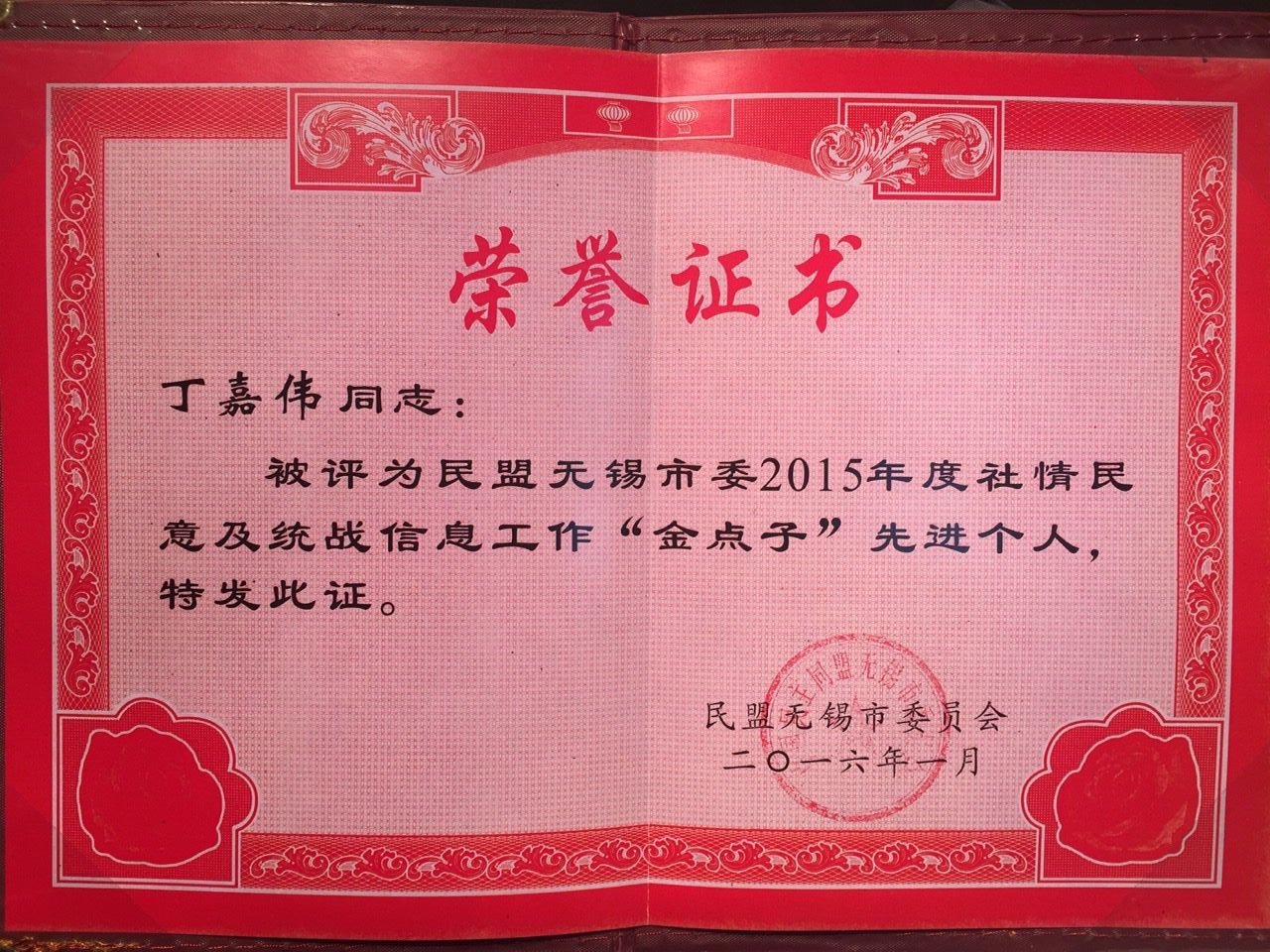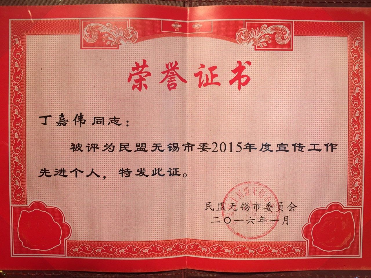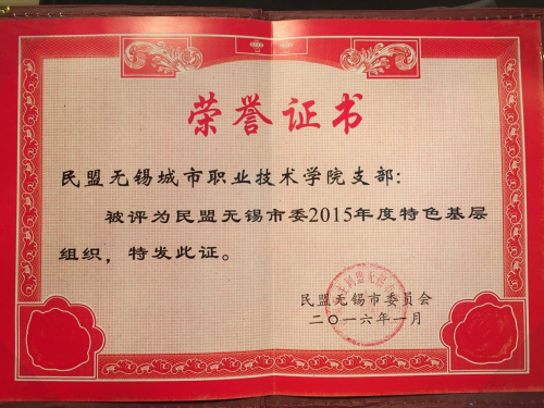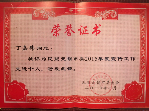 近日,民盟无锡市委举行十二届六次全委(扩大)会议,通报了2015年度各基层组织宣传的上报和发表、社情民意的上报和采用、专题调研的立项和完成、社会服务工作开展和效果情况,表彰了在各项工作中表现突出的单位和个人。民盟无锡城职院支部在全体盟员共同努力下,积极开展组织活动,积极参政议政,撰写提案,被评为民盟无锡市委员会2015年度特色基层组织先进集体;丁嘉伟同志荣获2015年度社情民意及统战信息工作“金点子”先进个人及宣传工作先进个人。