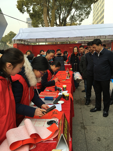 汪泉市长来到手书春联摊位看望我院志愿者 汪泉市长与志愿者们亲切交谈
