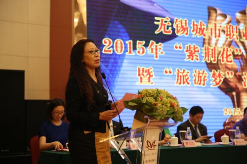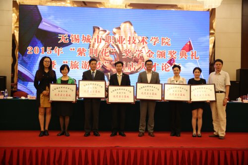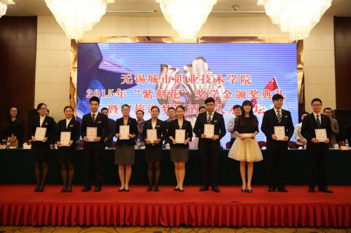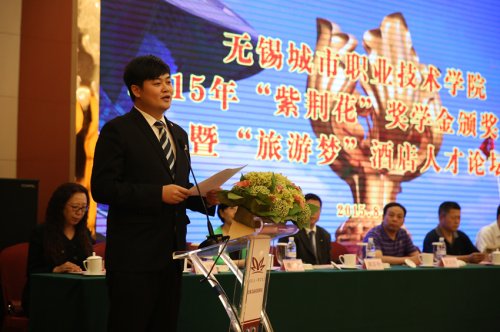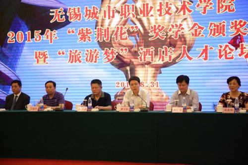 8月31日下午,无锡城市职业技术学院2015年“紫荆花”奖学金颁奖典礼暨“旅游梦”酒店人才论坛在无锡艾迪花园酒店隆重举行。市政协港澳台侨外事民宗委主任朱锡喜、副主任王观华、市政协港澳台侨民宗处处长谈惠娣、市政协港澳委员邹伟文,无锡旅游饭店业协会会长黄鉴中,无锡城市职业技术学院副院长瞿立新与旅游学院师生代表、酒店业代表、获奖学生等100余人参加了颁奖典礼,旅游学院党总支副书记陈霞主持颁奖典礼。