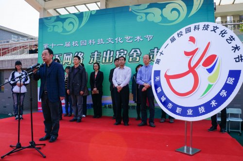 院长郁宝荣致开幕词,郁院长指出,科技文化艺术节作为一项系列化的校园文化活动,为我院学生加强思想修养、培育创新能力、提高综合素质提供了平台,他希望校园科技文化艺术节能够真正成为全面贯彻党的教育方针,努力培养学生的创新精神和实践能力,进一步加强校园文化建设的有效载体。郁院长为第十一届科技文化艺术节揭标。