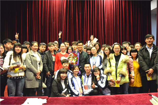 3月21日10:30,随着我院图文信息中心大报告厅全场的掌声而起,湖南卫视著名主持人李锐老师步入了现场,为大家带来《做一个简单、快乐、幸福的人》的讲座。 此次讲座由无锡城市职业技术学院图书馆和院团委共同主办,无锡新华书店承办。讲座中,李锐用幽默搞笑的段子提醒大家要思考人生,思考生命,并巧妙的运用《爸爸去哪儿》里的小狗“乖乖”的人生来鼓励同学们要乐观、开朗,同学们的笑声和掌声贯穿整场。讲座中,同学们也感受到了李锐作为一名著名主持人的乐观豁达。讲座结束后,在新书《别拿村长不当干部》的签售会上,李锐也积极配合粉丝们合影留念。 李锐,湖南卫视著名节目主持人,因《爸爸去哪儿》而走红的“国民村长”。首次推出个人作品《别拿村长不当干部》,书中记录了自己独特而有趣的电视生涯及成长经历。以阳光幽默的笔触,独家揭秘《爸爸去哪儿》中五个宝贝的幕后故事,以及与妻女的温情生活。 来源:团委、图书馆 “国民村长”李锐和粉丝们合影留念 |