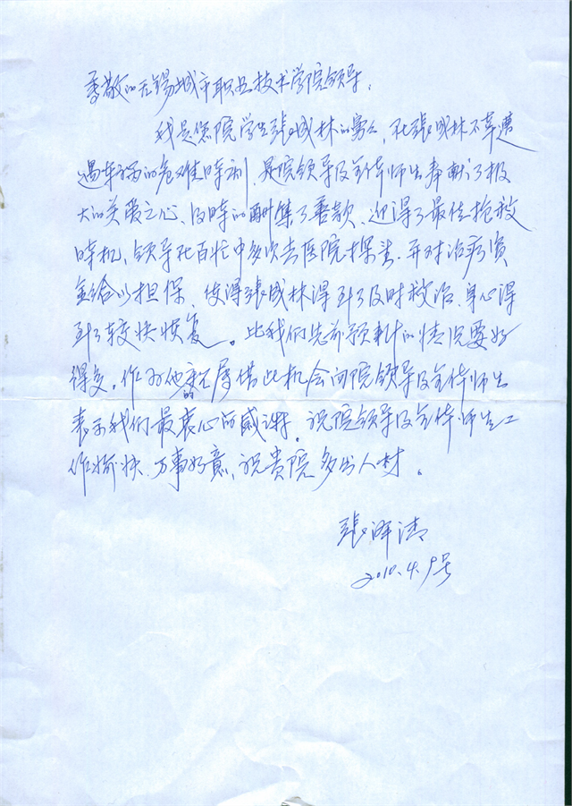 我院遭遇车祸学生已无大碍,其舅写信感谢学校