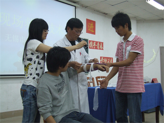 在全国第二个防灾减灾日来临之际,院团委、红十字会、学生会在马山校区举行了全国防灾减灾日急救演示、演练活动。