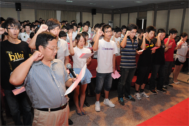 院长、党委副书记周伟灿同志领誓,新党员在党旗下庄严宣誓