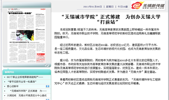 “无锡城市学院”正式筹建 为创办无锡大学“打前站”