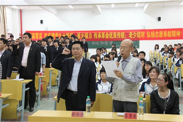 5月12日下午,我院经济贸易管理系“党的光辉照我行”系列活动之“如歌岁月 党育我行”主题活动在阶111教室隆重举行。活动以同温誓言,共庆建党九十周年华诞;星火接力,传承革命优良传统;老少结对,弘扬志愿奉献精神三大主题活动为载体,共庆共产党90华诞。溪南军休所所长徐洪才同志,退休老军人李景逊同志,经管系党政领导,教职工和学生党员、入党积极分子,全体辅导员、各班学生代表参加了活动。