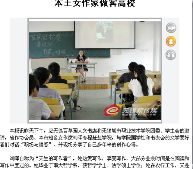 昨天下午,应无锡百草园人文书店和无锡城市职业技术学院团委、学生会的邀请,省作协会员、本市知名女作家刘晖专程赶赴学院,与学院国学社和书友会的文学爱好者们对话“职场与情感”,并现场分享了自己多年来的创作心得。