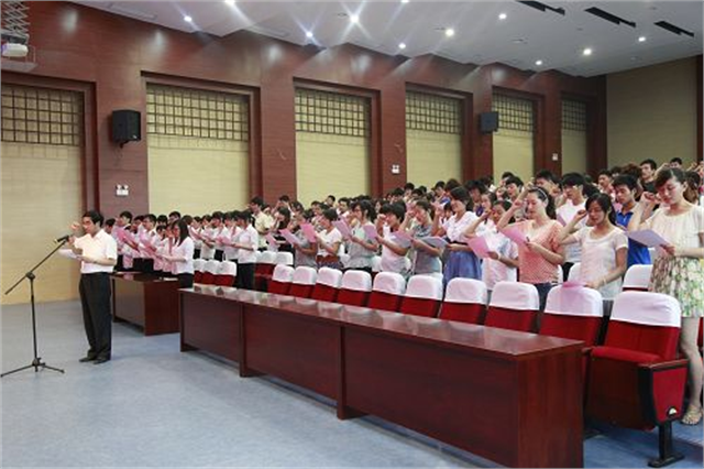 在院党委副书记刘彬同志的领誓下,全院232名教职工和学生新党员庄严宣誓