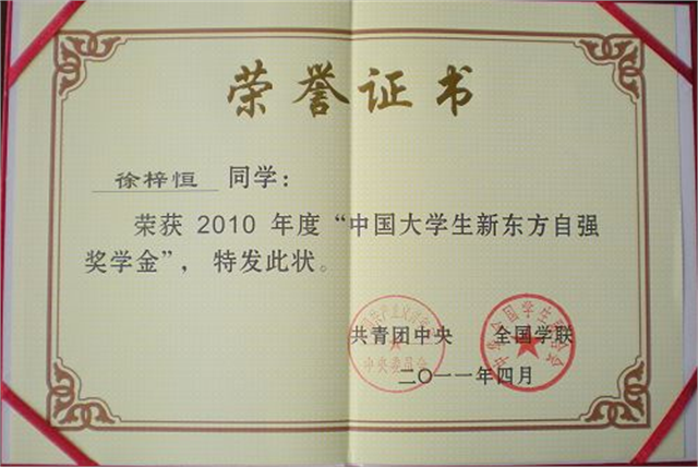 徐梓恒同学荣获“中国大学生自强之星”提名奖