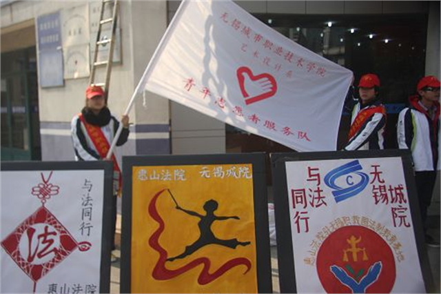12月2日上午,我院艺术设计系12名学生志愿者在系党总支副书记陈霞老师的带领下,前往钱桥藕乐苑小区参加了由惠山法院驻无锡职教园法制教育基地主办的“发扬优良传统,服务幸福惠山”院校携手送法进社区活动。