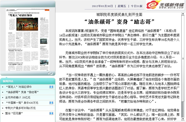 《无锡商报》:城职院年度颁奖典礼别开生面 “油条颜哥”变身“励志哥”
